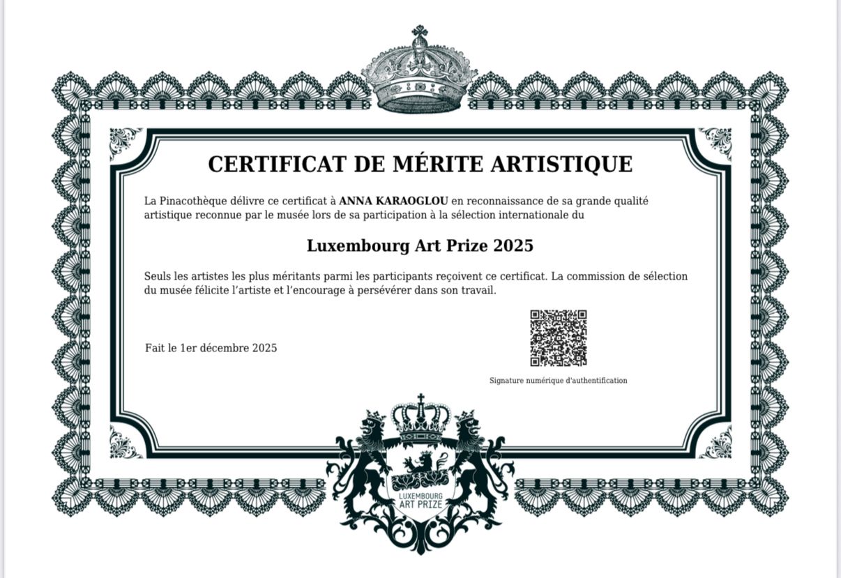 « Honorée de recevoir ce certificat du Prix d’art du Luxembourg 2025. Je suis reconnaissante de cette distinction » AK.